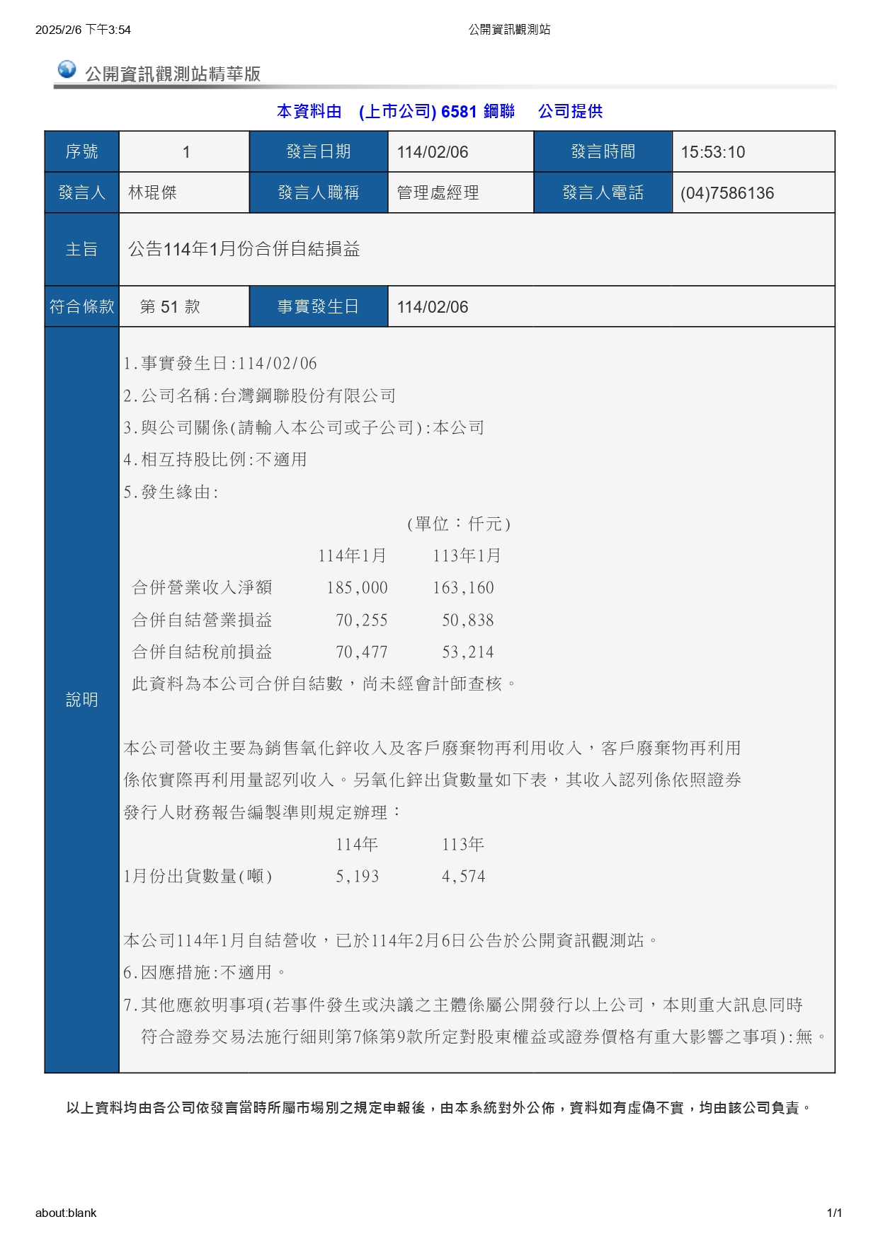公告114年01月份合併自結損益