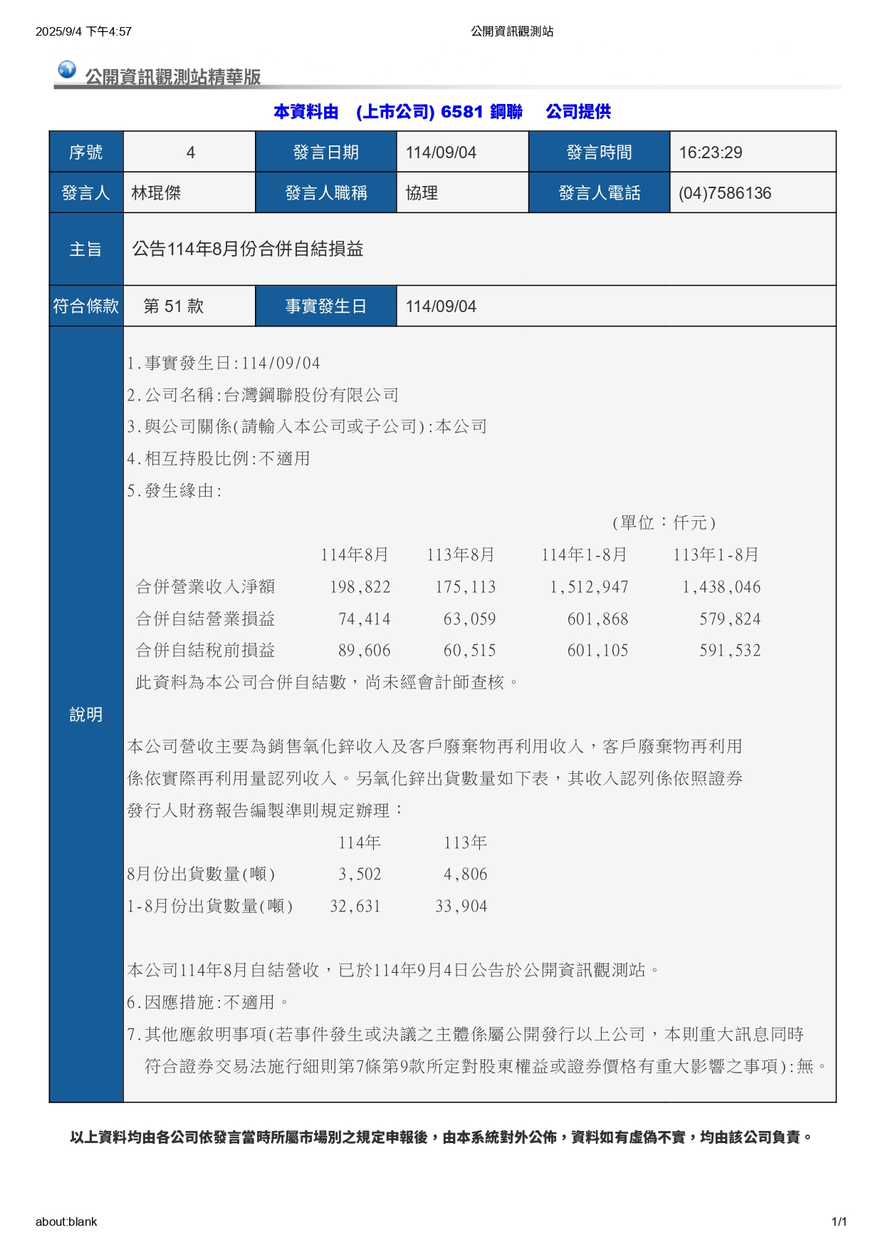 公告114年08月份合併自結損益 Home / 營收公告 / 營收公告 2025/09/04 公告114年08月份合併自結損益 Previous 關於台灣鋼聯 公司簡介公司沿革企業核心價值政策認證與證書關係企業 產品與服務 旋轉窯製程可收受廢棄物/資源物項目專業服務粗氧化鋅 新聞中心 營收公告媒體報導公司榮譽與永續行動 投資人專區 財務資訊公司治理股東服務 承攬商登錄系統 入廠登錄系統操作說明承攬商作業相關表單 環境監測 監測資訊 聯絡我們 聯絡方式交通資訊不法行為舉報 台灣鋼聯 ESG Youtube 台鋼資源網站