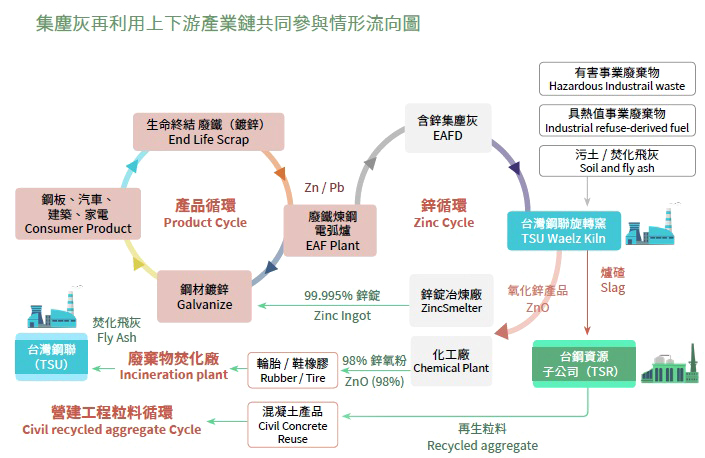 此循環模式不僅減少天然鋅礦的開採與環境負荷,更有效解決電弧爐煉鋼業的有害廢棄物去化問題,成為「城市採礦」的成功典範。台灣鋼聯在110年起陸續擴大可再利用之產業類別,如表面處理業、化工業、金屬加工業等產業產出之含鋅廢棄物/資源物,以及垃圾焚化廠產生之焚化飛灰,減少天然資源之耗用,讓看似無用的廢棄物重新進入產業鏈,化身可再利用的再生原料,且避免廢棄物進入填埋場。