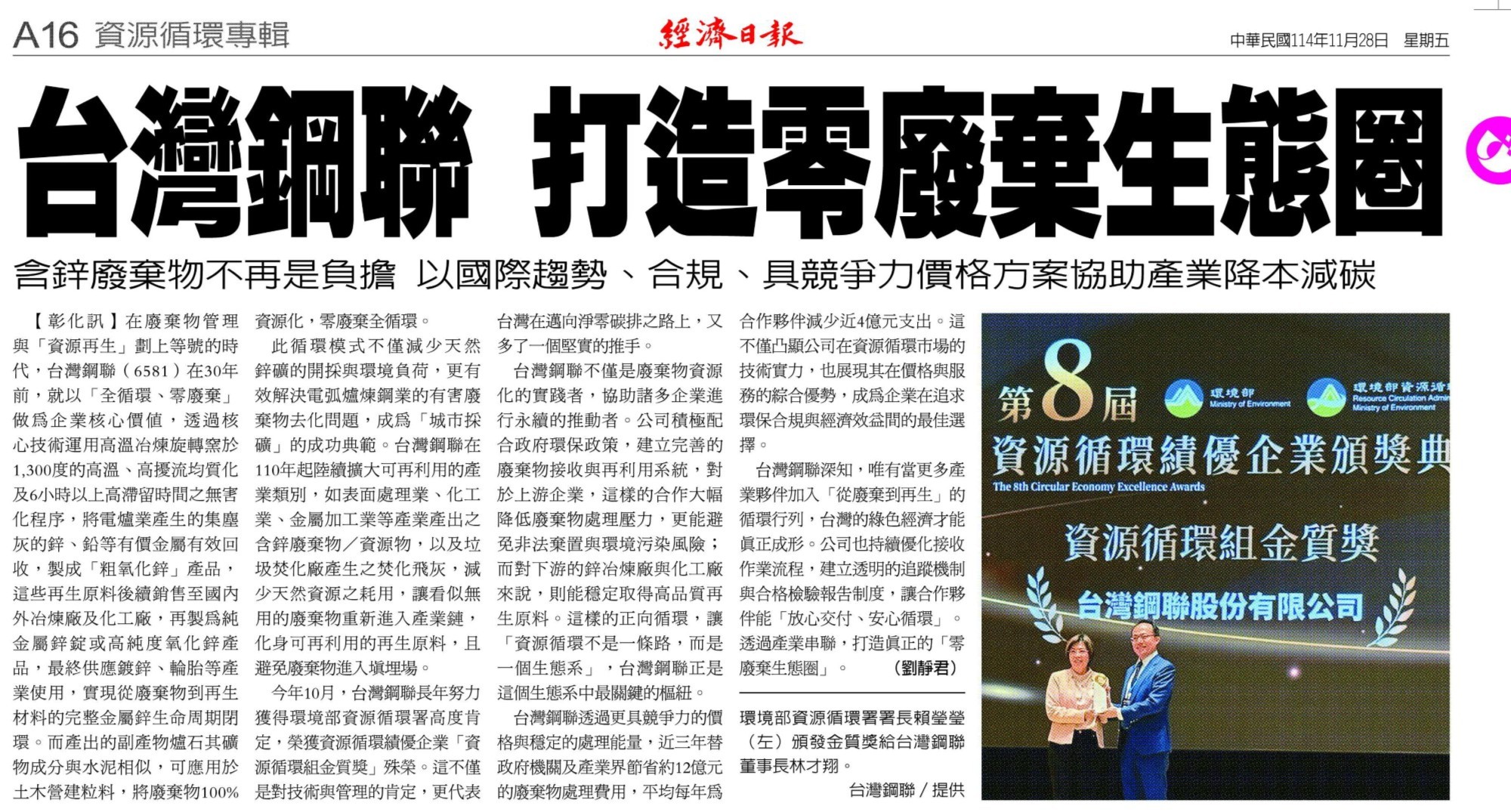 Economic Daily News: Taiwan Steel Union Creates a Zero-Waste Ecosystem Home / ESG / ESG 2025/11/28 Economic Daily News: Taiwan Steel Union Creates a Zero-Waste Ecosystem Previous 關於台灣鋼聯 公司簡介公司沿革企業核心價值政策認證與證書關係企業 產品與服務 旋轉窯製程可收受廢棄物/資源物項目專業服務粗氧化鋅 新聞中心 營收公告媒體報導公司榮譽與永續行動 投資人專區 財務資訊公司治理股東服務 承攬商登錄系統 入廠登錄系統操作說明承攬商作業相關表單 環境監測 監測資訊 聯絡我們 聯絡方式交通資訊不法行為舉報 台灣鋼聯 ESG Youtube 台鋼資源網站