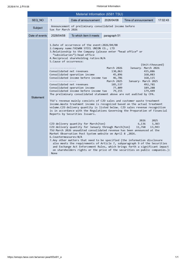 Announcement of Consolidated Profit and Loss for March 2026 Home / News / News 2026/04/08 Announcement of Consolidated Profit and Loss for March 2026 Previous 關於台灣鋼聯 公司簡介公司沿革企業核心價值政策認證與證書關係企業 產品與服務 旋轉窯製程可收受廢棄物/資源物項目專業服務粗氧化鋅 新聞中心 營收公告媒體報導公司榮譽與永續行動 投資人專區 財務資訊公司治理股東服務 承攬商登錄系統 入廠登錄系統操作說明承攬商作業相關表單 環境監測 監測資訊 聯絡我們 聯絡方式交通資訊不法行為舉報 台灣鋼聯 ESG Youtube 台鋼資源網站