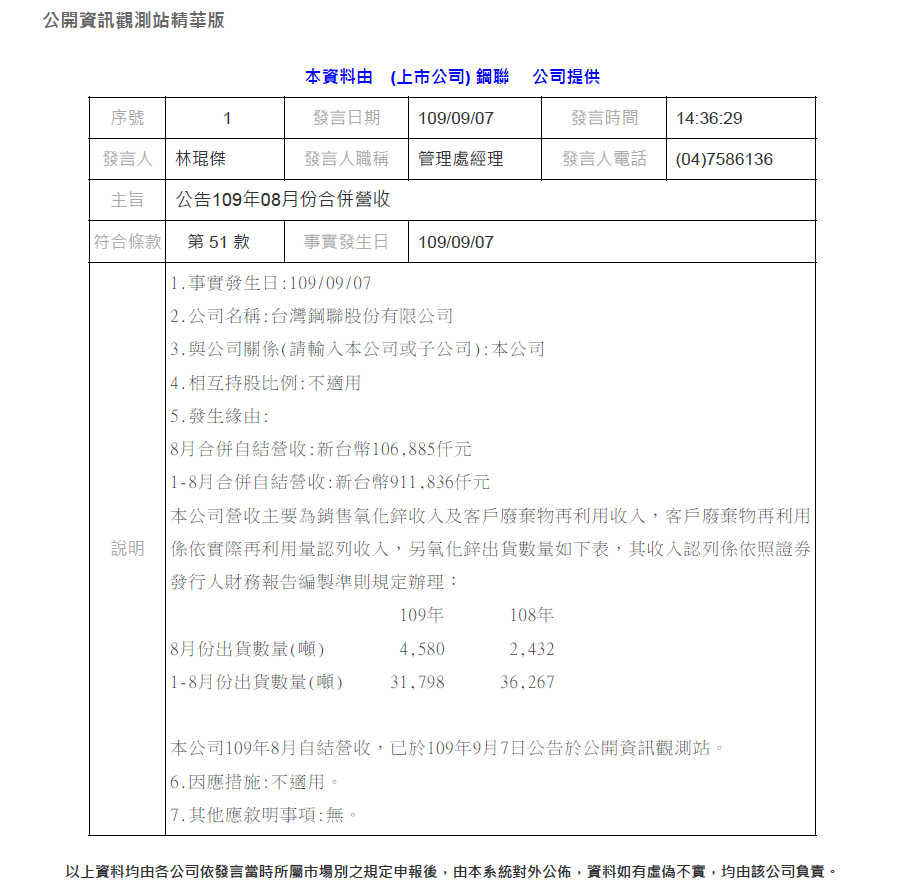公告109年8月份合併營收